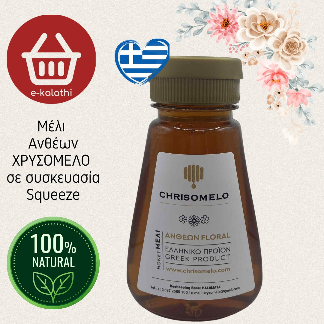 Το μέλι ανθέων ΧΡΥΣΟΜΕΛΟ σε πρακτική συσκευασία squeeze συνδυάζει την αγνότητα της φύσης με την ευκολία στη χρήση. Παράγεται από νέκταρ λουλουδιών που χαρίζουν στο μέλι ένα ισορροπημένο, γλυκό άρωμα και πλούσια γεύση.